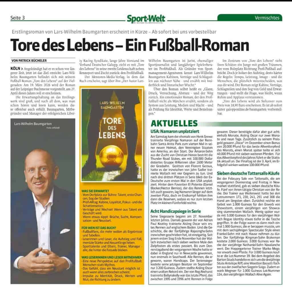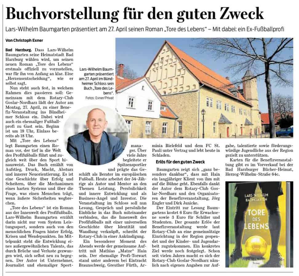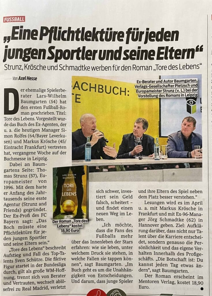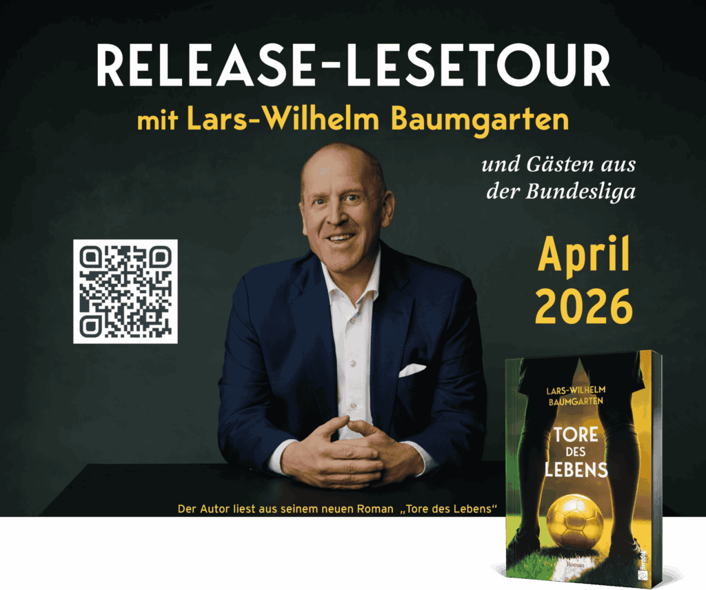 Lars-Wilhelm Baumgarten liest in verschiedenen nationalen und internationalen Stationen aus seinem Erstlingswerk “Tore des Lebens”. Auf jedem Stop wird er einen speziellen Gast einladen, wie ehemalige Profi-Fußballer, Sportvorstände, Trainer und Experten aus der Bundesliga. Dabei sein ist alles, also sichern Sie sich jetzt Ihre Plätze für die begehrte Lesetour.